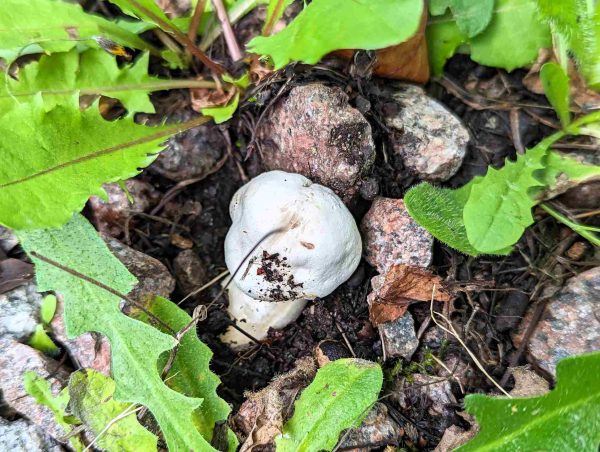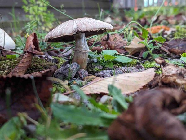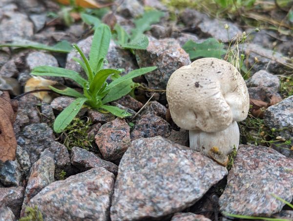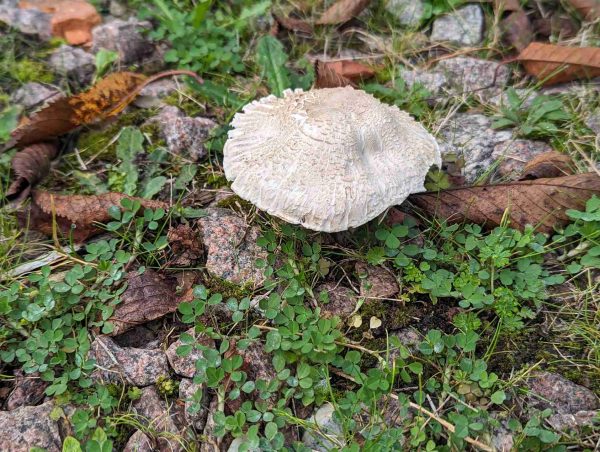 Initially ovate, then broadening to flat with a raised, buff apex – these fungi had white caps and cream stems.