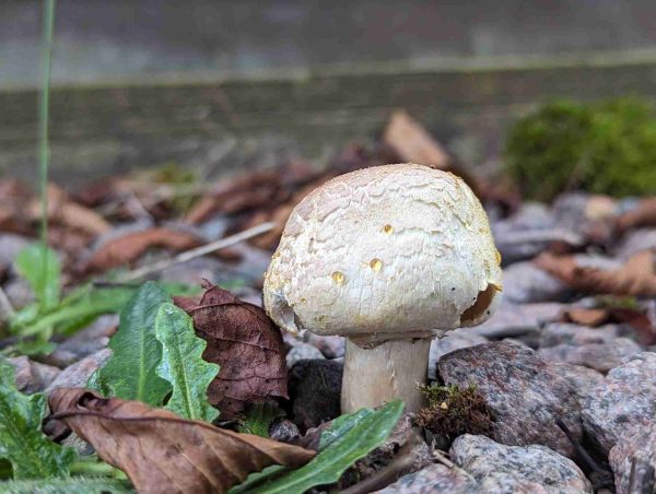 They had buff-yellow caps with pale brown flecks/scales, and a thick cream stem.