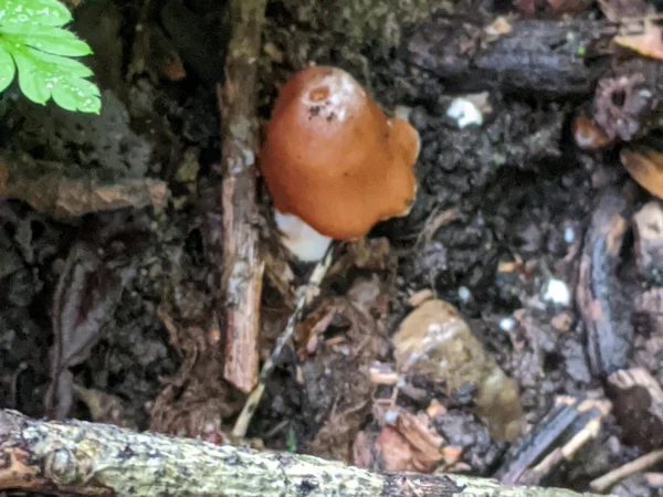 Found in leaf litter, this had a light orange-brown cap and a thick white stem with no annulus.