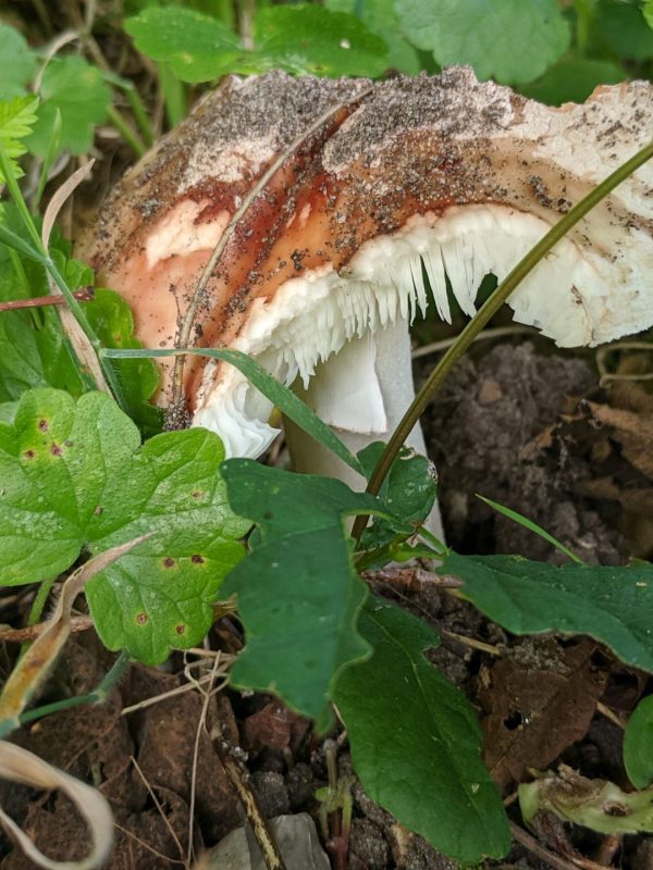 One was older, lacking cap speckles, and the other juvenile, fallen over displaying the high-up, skirt-like annulus.
