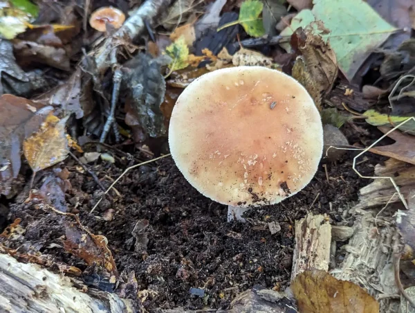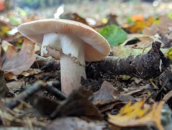 It had a pinkish buff cap fading to cream, with a large, white annulus, striated and browning at the edges.