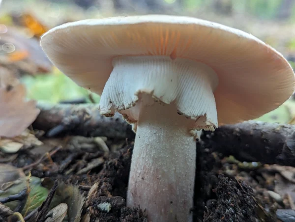 It had a pinkish buff cap fading to cream, with a large, white annulus, striated and browning at the edges.