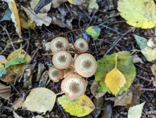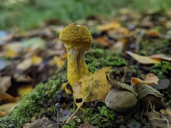 They had a vinaceous brown cap with lots of yellow hairs which were lighter where the stem met the cap.