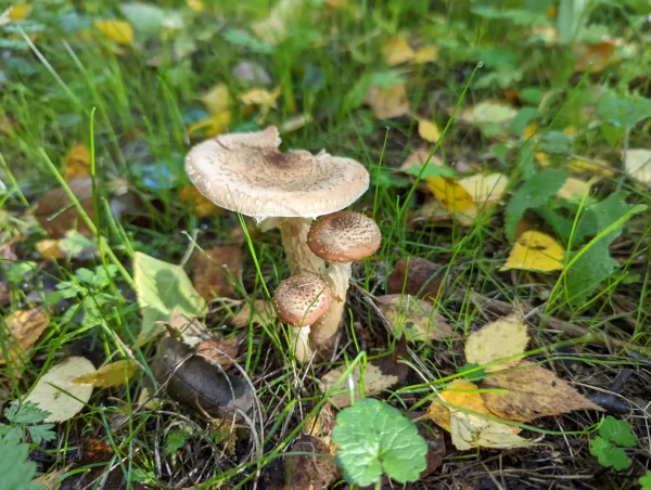 The cluster in the second photo had the same fibrous stems fading to peach at their bases and brown caps with yellow fur at their edges.