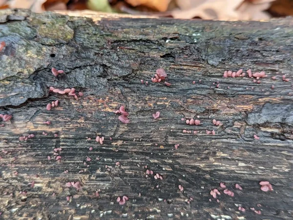 These tiny purple fungi were coral-like and found in a large group on a rotting log.