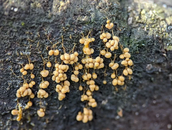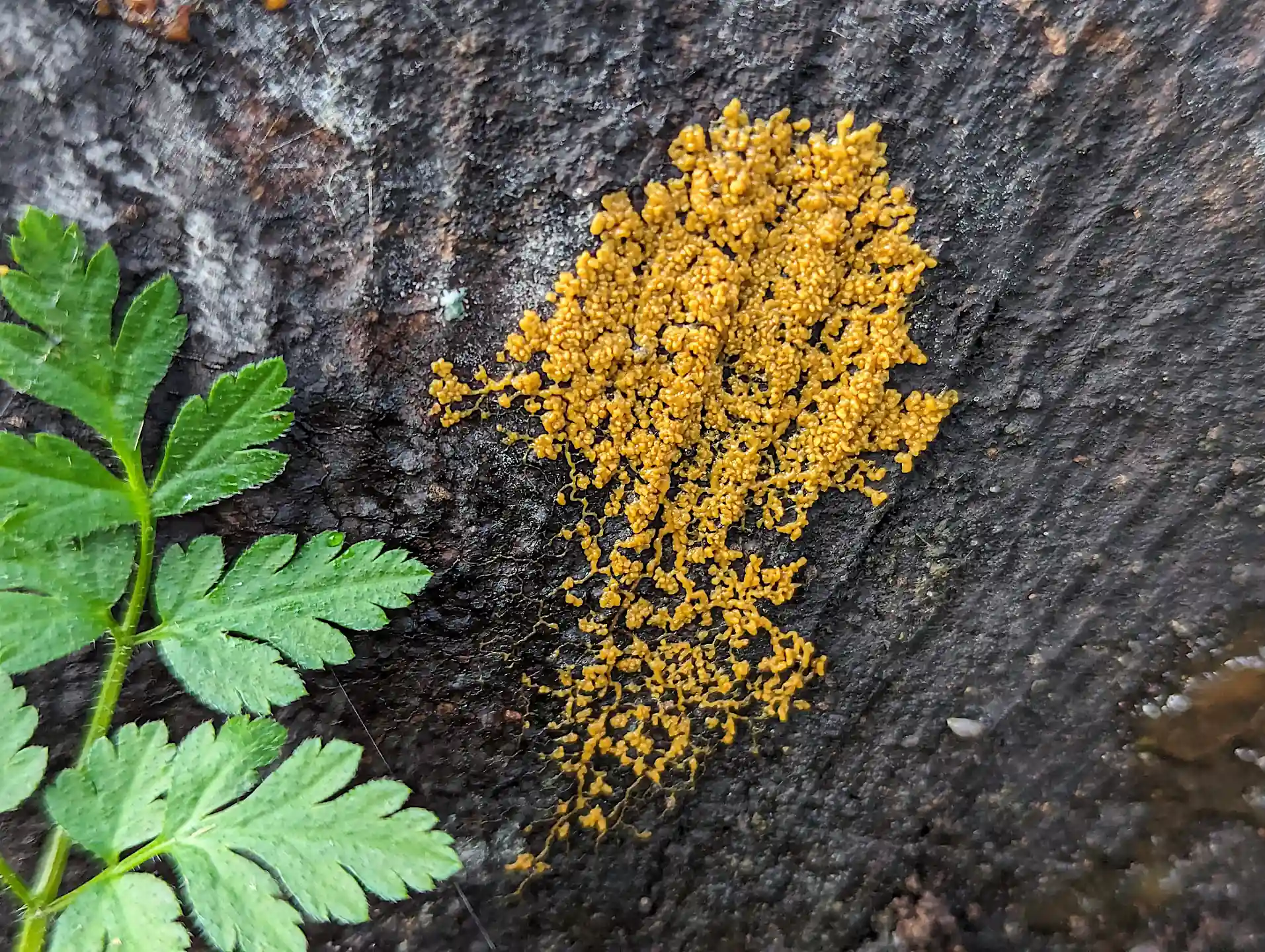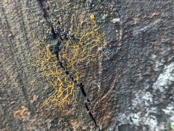 It was a curry-yellow, veiny plasmodium, forming clusters.
