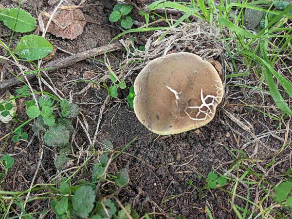 Found under a bench on the path, this fungus had a brown cap with white cracks and a pale yellow edge.