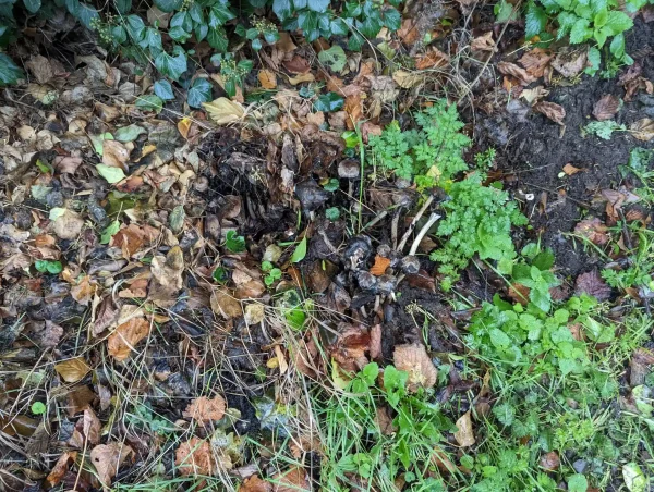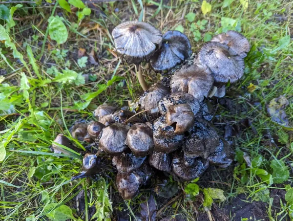In large clustered groups in two areas near the car park and the path; either growing in leaf litter or grass.