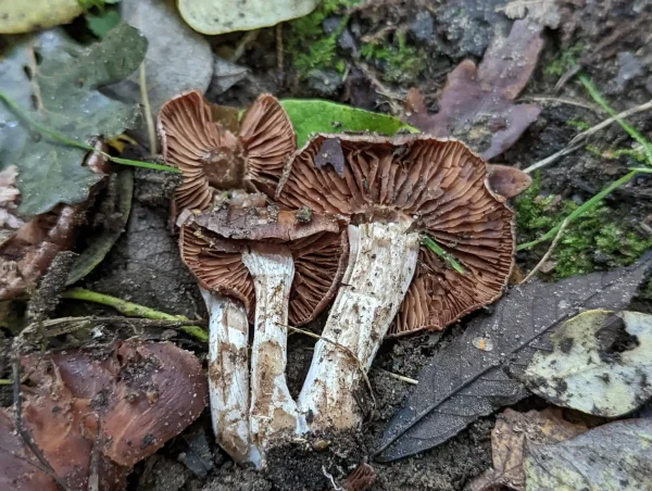 These clustered fungi were found growing on soil with deep brown caps and white edges.