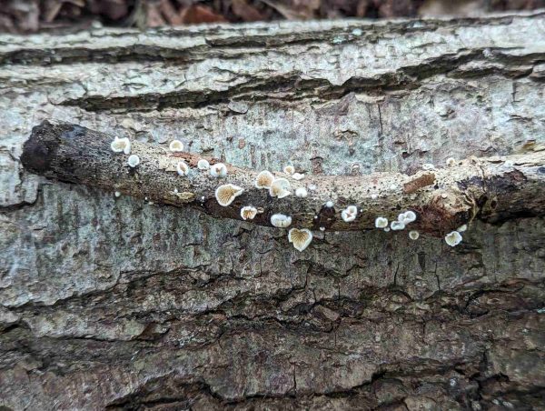 Found in a large group on a small fallen branch, these had buff gills and furry, white caps.