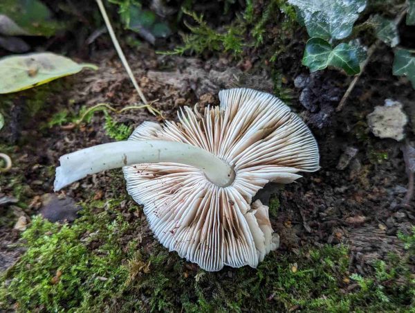 Uprooted on the path to the Basecamp, this fungus had a silky white stem and pinkish buff gills.