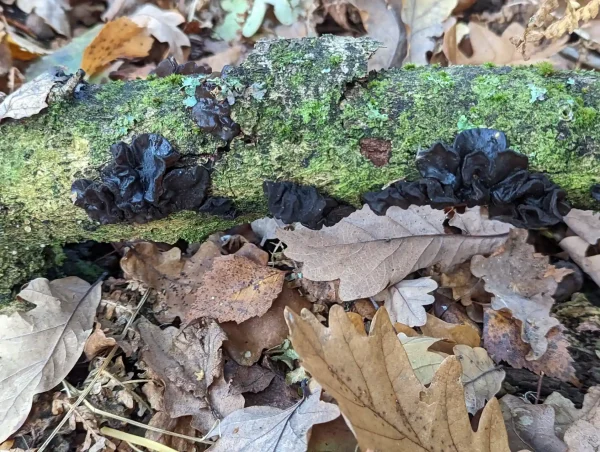 This clump of dark brown jelly was found on a lichen-encrusted rotting log.