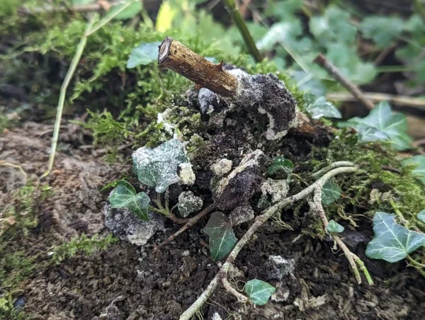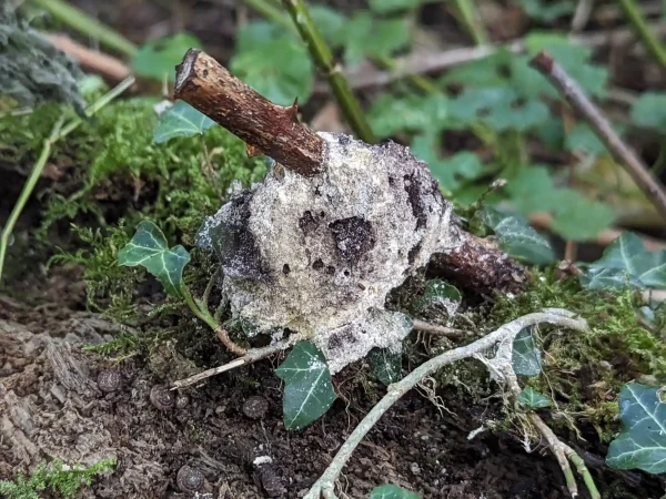 This slime mould was spotted on a rotting log, growing around a bramble stem.