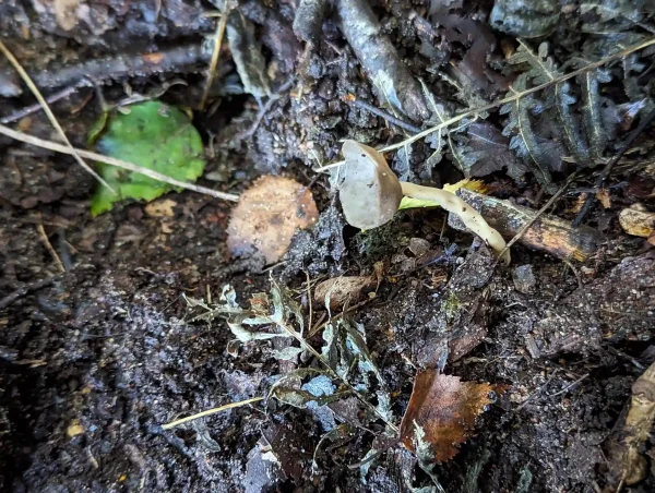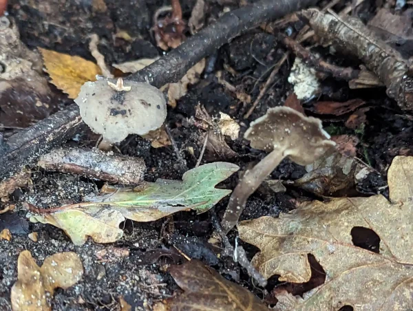 These had grey to greyish brown cup-shaped caps and long, cream, wiggly stems.
