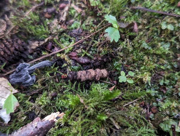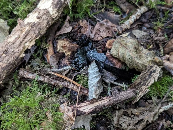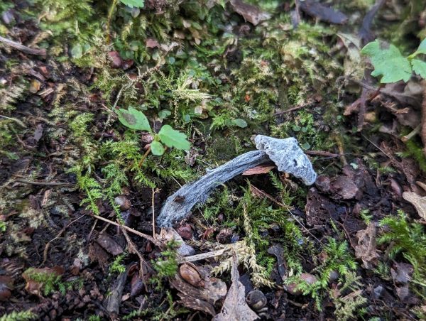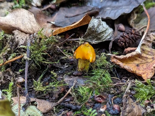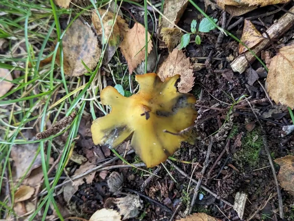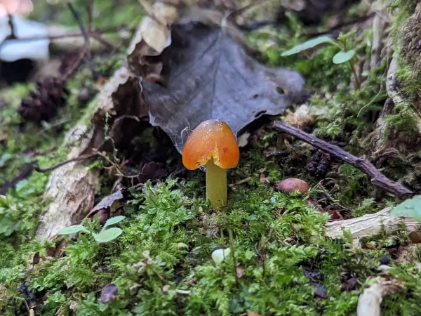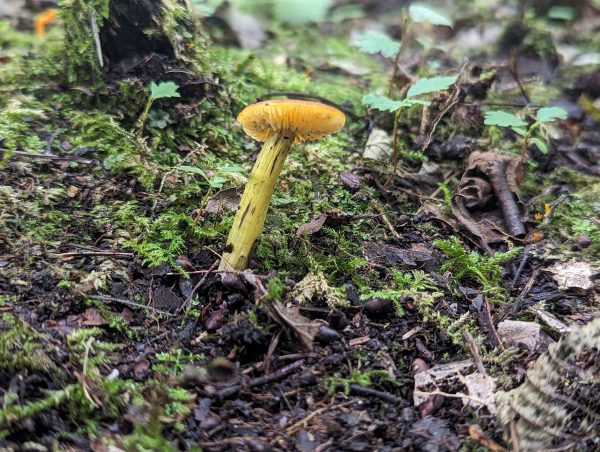 On damp soil in a shaded area, this fungus had a blackening olivaceous apex and orange cap.