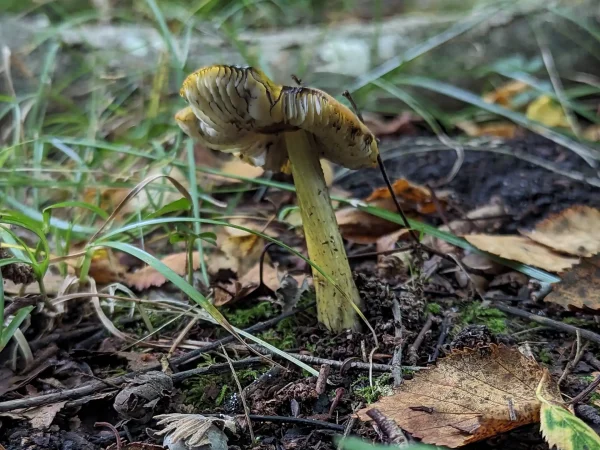 It was tall, with an olivaceous yellow cap, fading at areas to brownish orange or black.