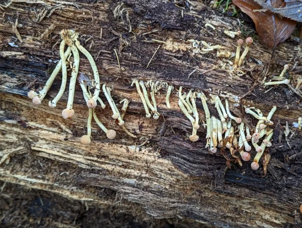 These clustered fungi had mottled orange-yellow caps and pale,sulphur-yellow stems.
