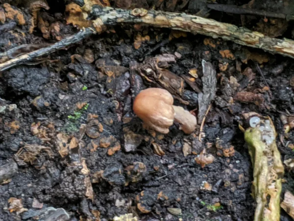 On soil under a dense canopy, in a damp area.