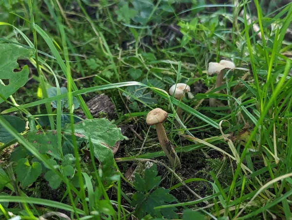 These grew in scattered all around the path in open grass and on soil or in leaf litter, near hazel.