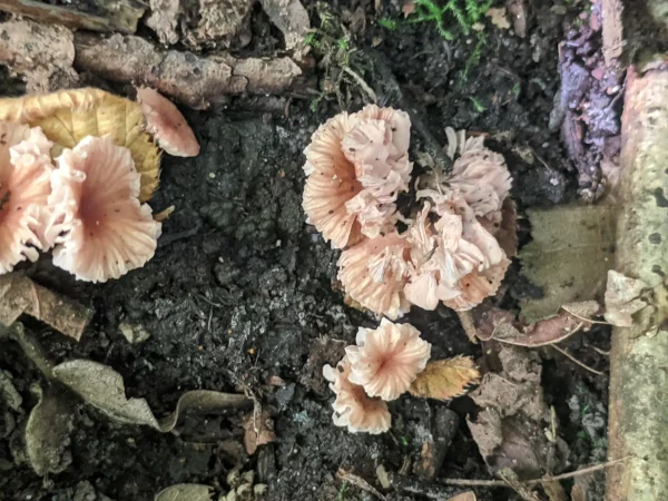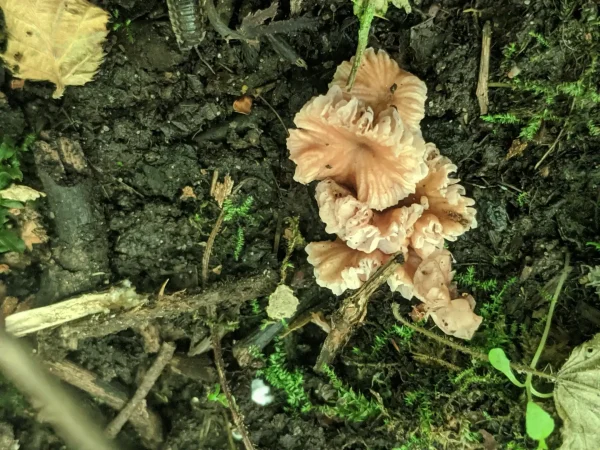 Spotted in clusters on soil and leaf litter under very dense canopy, these had very wavy and upturned brownish-red caps, fading lighter at their edges.