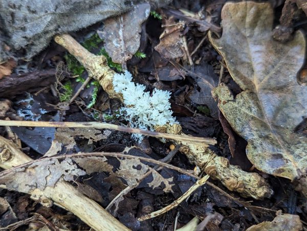 This slime mould was found on the right of the path to Gnarly Oak on rotting leaves.