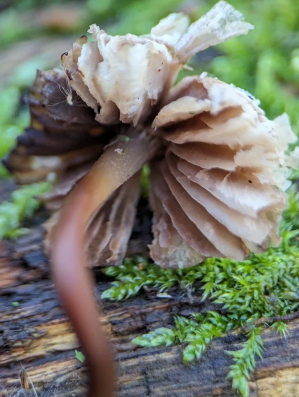 In this photo on Day 19, you can see the gills and stem up close — there are no grooves on the stem, so it is not M. polygramma.