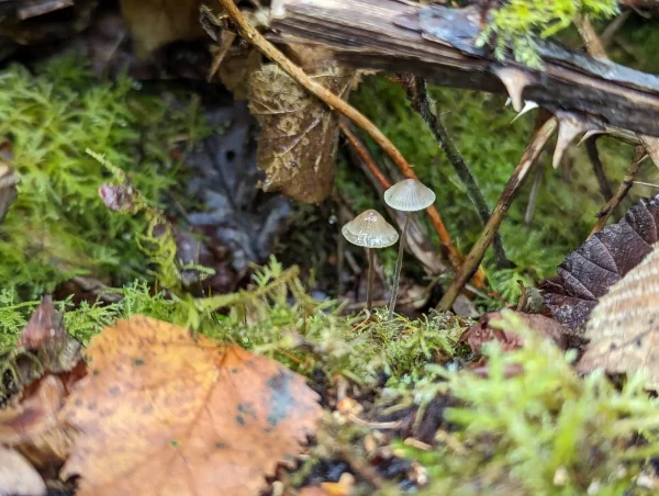 Found on moss by the path, these two had greyish brown stems and conical, brown caps, which faded to white at their edges.