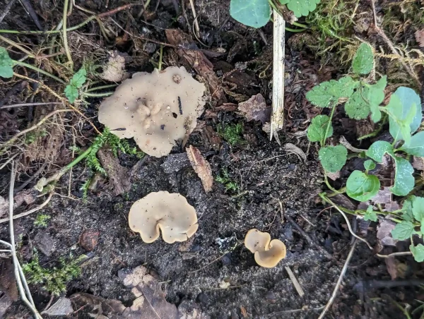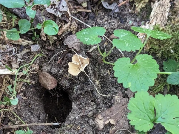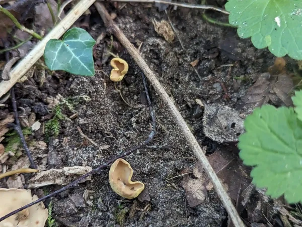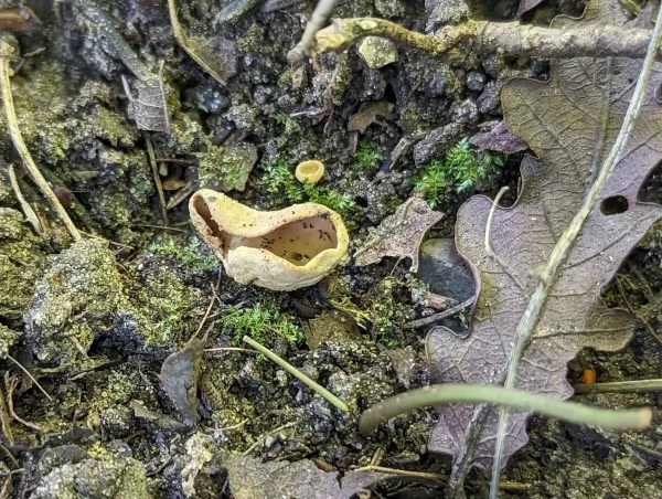 I found a Peziza (cup fungus) on the ground with moss and leaf litter.