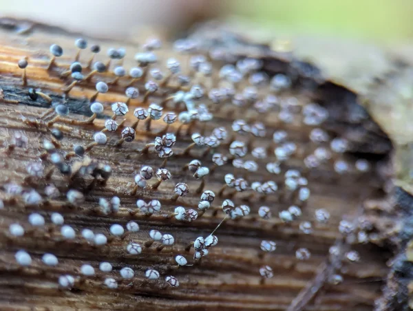 They had light to dark, bluish grey sporocysts and brown stems which tapered towards the top.