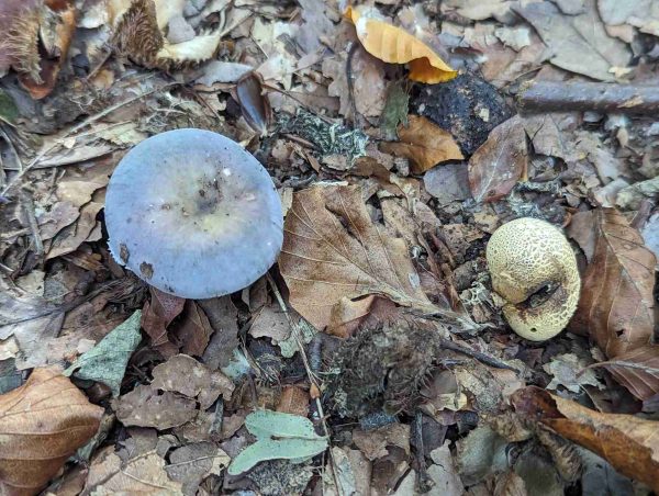 These had white stems and gills, but a greyish-violet cap with an olivaceous, dipped centre.