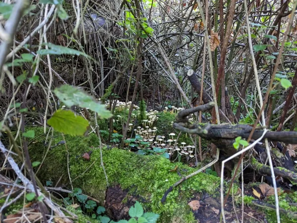 Behind Basecamp, on the path to the railway line, I went to visit the ivy covered tree stump that was covered in Psathyrella piluliformis.