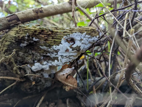 On the side of rotting wood, I spotted the slime mould Ceratiomyxa fruticulosa (Fig. 5.9) and trooping on the tops of the logs were Mycena galericulata (Fig. 5.10).