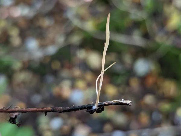 An exiting discovery was white Clavaria (Fig. 5.15) as well as a an orange Clavulinopsis luteoalba or Clavaria amoena (Fig. 5.17) and the “stalk” fungi we had seen some years ago on a visit to the reserve — later identified as Typhula juncea (Slender Club) (Fig. 5.18) — were growing in this wooded area.