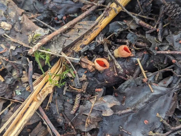 In the Sandy-Glade Area, I found a group of Sarcoscypha (Fig. 26.3) on rotting, mossy wood.