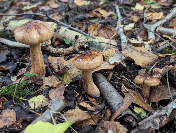 The larger two had buff stems with brown streaks and orange-brown caps fading to buff at their edges.