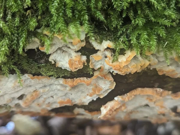 I found these white, corticioid patches on a trunk fallen over a drainage ditch.