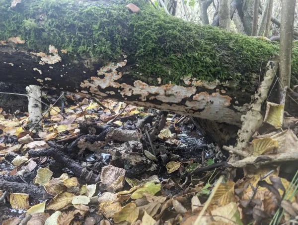 I found these white, corticioid patches on a trunk fallen over a drainage ditch.