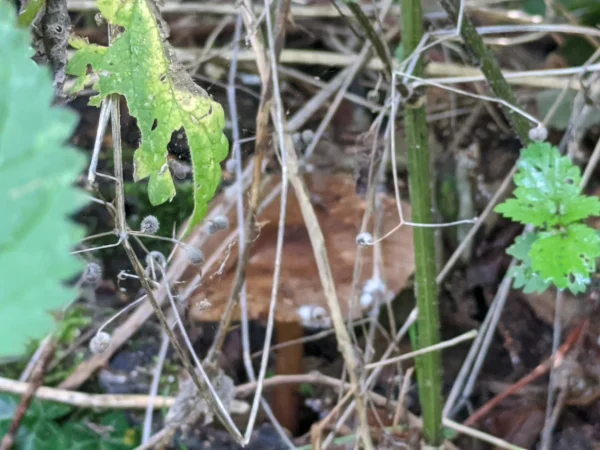This unidentified species had a 100mm across brown cap with an off-white edge and was raised at the apex.