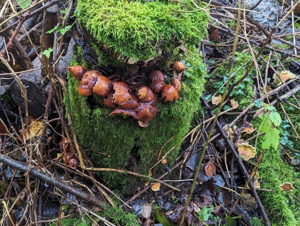Found clustered on a mossy stump, these had glossy, cinnamon coloured caps which faded to bright, yellowish-brown apexes.