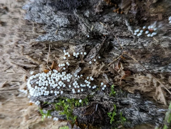 I spotted these clusters of orange sporangia covering moss and surrounding leaves.