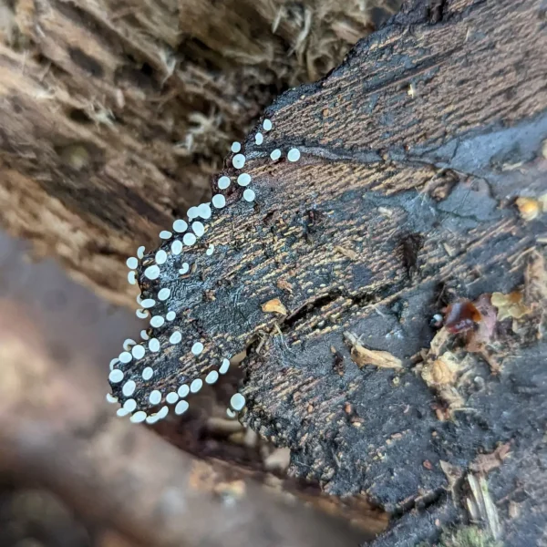 These fruiting bodies were clustered all around the edge of a rotting log.