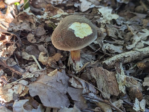 This fungus had a greyish brown cap-surface, a large chunk taken out of it to reveal light pale yellow, spongy flesh, covered to some extent in brownish-red cracks.